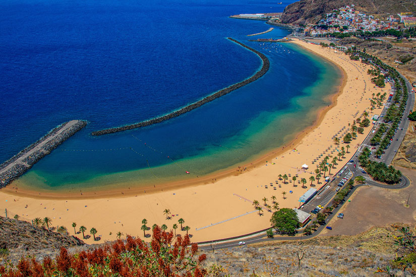 Wenn ihr lieber an einem hellen Sandstrand baden gehen wollt, solltet ihr in der Nähe von Santa Cruz bleiben. Dort wurde die Playa de las Teresitas künstlich angelegt. Zur Verschönerung tragen Palmen bei. Ursprünglich war auch dieser Strand schwarz, wurde jedoch mit feinstem Sand aus der Sahara überschüttet.