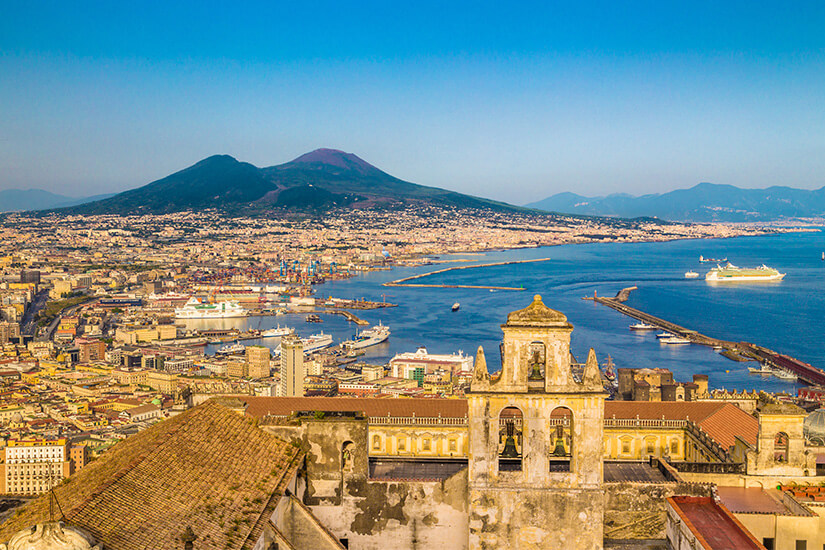 Der Vesuv liegt direkt am Golf von Neapel. Tragische Berühmtheit erlangte er durch seinen katastrophalen Ausbruch im Jahr 79 n. Chr. Dabei wurden die antiken Städte Pompeji und Herculaneum unter einer sieben Meter dicken Schlacke- und Ascheschicht begraben. Steine und Asche prasselten auf die Stadt Pompeji nieder – und zwar drei Tage lang und ununterbrochen. 5.000 Einwohner kamen dabei ums Leben.