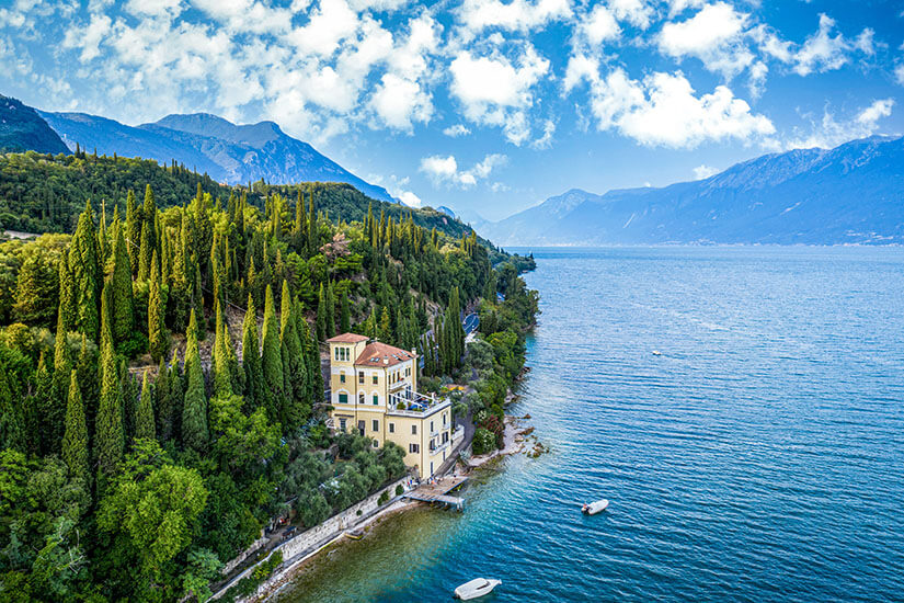 Das Herzstück bildet die Villa Guarienti aus dem 16. Jahrhundert, umgeben von einem weitläufigen Park mit jahrhundertealten Zypressen, Olivenbäumen und mediterranen Pflanzen. Der kleine Hafen mit seinen Fischerbooten und der historischen Taverne strahlt eine zeitlose Eleganz aus. Hier speisten bereits Persönlichkeiten wie Winston Churchill, König Charles von England und die britische Königsfamilie während ihrer Besuche am Gardasee.