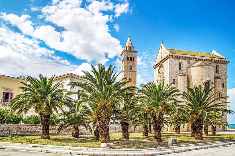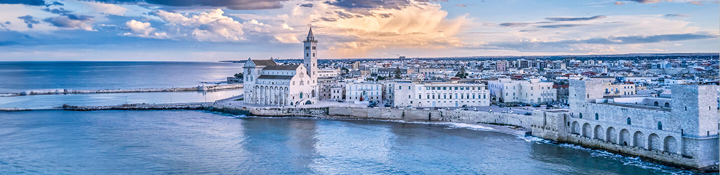 Trani ist eine italienische Hafenstadt an der Adria in Apulien. Sie zeichnet sich durch den typisch italienischen Charme mit weiß gekalkten Gebäuden am türkisfarbenen Meer aus. Dort sind Strandliebhaber und Wassersportler genau richtig. Auch Naturliebhaber und Wanderer fühlen sich wohl, da die Landschaft von Olivenbäumen und Mohnblumen geprägt ist.