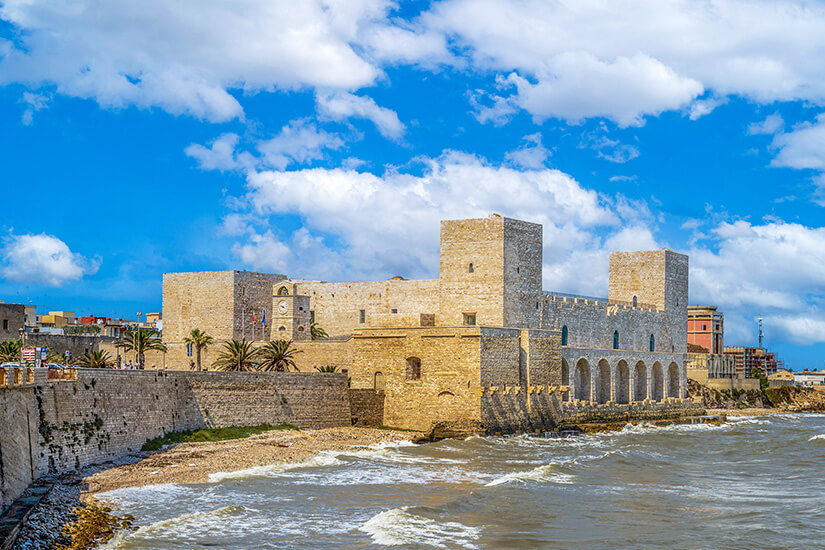 Diese imposante Küstenfestung wird kurz Castello di Trani genannt. Es handelt sich um eine Niederungsburg in Uferlage, die zwischen 1233 und 1249 entstanden ist. Sie wurde unter der Herrschaft von Kaiser Friedrich II. errichtet. Dank ihrer Lage auf einer Felsenbank im Zentrum der Bucht von Trani wurde sie vor Beschädigungen durch das Meer geschützt. Gefundene Überreste deuten darauf hin, dass es an derselben Stelle im 10. oder 11. Jahrhundert einen Turm gegeben haben muss. Heute dient das Castello Svevo di Trani als Museumsburg und als Veranstaltungsort für Ausstellungen und Konzerte.
