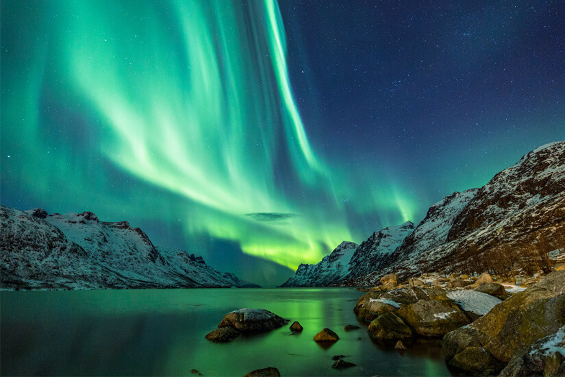 Da Tromsø unter dem „Nördlichen Polarlichtoval“ liegt, sind die Naturphänomene hier aufgrund der Struktur des Erdmagnetfeldes häufig und intensiv zu beobachten. Am besten zu sehen sind die Nordlichter in der Winterzeit, von Ende September bis Ende März. Die besten Chancen auf die Aurora borealis habt ihr bei kaltem und trockenem Wetter. Zudem ist es empfehlenswert, die späten Abendstunden zu nutzen. Im Rahmen einer geführten Tour, beispielsweise einer Rentier-Safari, sichert ihr euch einen perfekten Platz, um die Lichter zu betrachten und in einem Bild festzuhalten. Oft geht es abends in Kleingruppen an Orte außerhalb der Stadt.