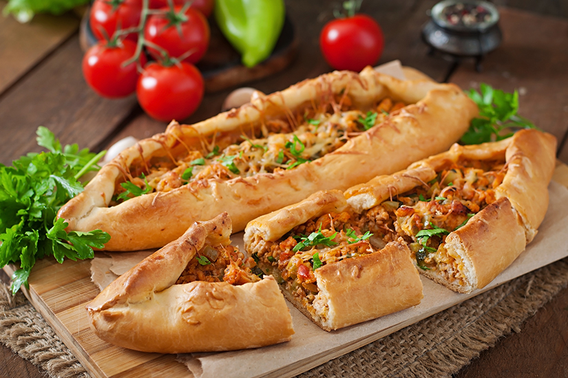 Die Türkei steckt voller Überraschungen – so auch in puncto kulinarischer Delikatessen. So erwarten euch bei einem Restaurantbesuch vor allem würzige Fleischgerichte mit frischen Joghurtdips, gebratenem Gemüse und reichhaltigen Hülsenfrüchten. Wollt ihr landestypisch essen gehen, könnte euer Dinner zum Beispiel so aussehen: Als Vorspeise (Meze) werden euch leckere Tapas serviert. Von gefüllten Weinblättern, über eingelegte Antipasti bis hin zu Schafskäsepasteten gibt es hier alles, was den Appetit anregt. Mit Fladenbroten (Pide) könnt ihr den cremigen Hummus dippen und mit einem Anisée Rakı Schnaps nicht nur den Appetit, sondern auch die Stimmung in Wallung bringen. Pide gibt es übrigens auch mit leckerer Füllung.