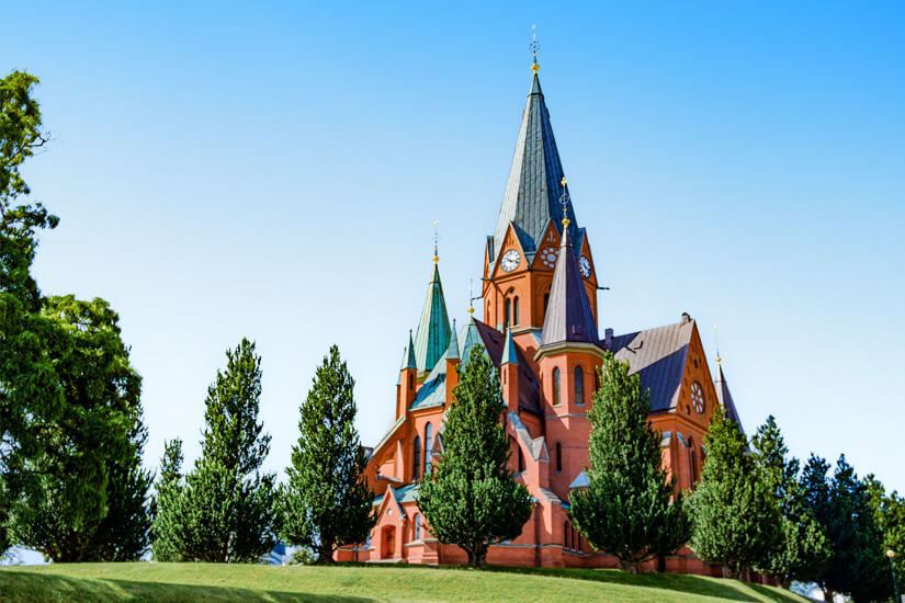 Die Sankt Petri Kyrka passt durch ihre rote Backsteinfassade perfekt in Västerviks Stadtbild. Sie wurde zwischen 1903 und 1905 erbaut, um die ehemalige St. Getruds-Kirche zu ersetzen. Geweiht von Bischof Carl Wilhelm Charleville besitzt sie einen neugotischen Baustil samt eindrucksvollen Fenstern und hölzernem Gewölbe im Mittelschiff. Gleich drei Orgeln stehen in der Kirche. Eine von ihnen wurde in der Hauptstadt Stockholm angefertigt, während die zweite und dritte Orgel der Sankt Petri Kirche aus Dänemark kommen. Gemeinsam entfalten sie bei Konzerten ein beeindruckendes Klangbild. Ein schönes Detail aus dem Innenraum ist ein Heiligenbild aus recycelten Militärplanen des Künstlers Mats Hermansson.