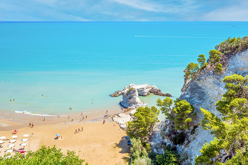 Die Stadt weiß Badeurlauber zu verzaubern. Entlang der zerklüfteten Küste Apuliens wechseln sich kilometerlange Sandstrände mit idyllischen Buchten ab. Das kristallklare Wasser, die eindrucksvollen Felsformationen und die entspannte Atmosphäre machen diesen Teil von Vieste zu einem Highlight der Reise. Von gemütlich bis aktiv ist für jede Stimmung der passende Abschnitt dabei.