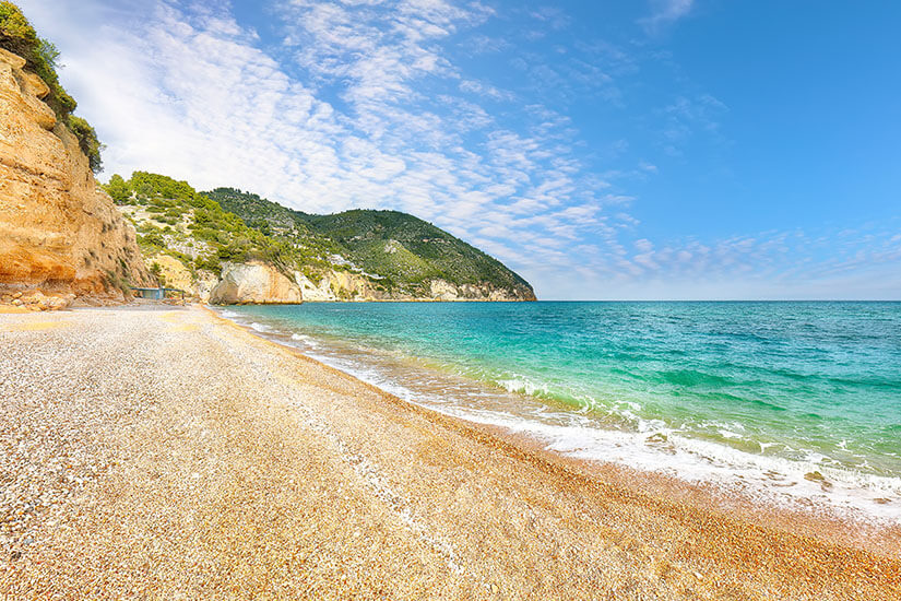 Etwas weiter westlich, in Richtung Mattinata, liegt ein weiterer traumhafter Strand, eingebettet zwischen hohen, weißen Kalksteinwänden sowie üppiger mediterraner Vegetation, die in Grün erstrahlt. Diese Bucht ist etwas abgeschieden und nur über einen kleinen Fußweg oder per Boot erreichbar. Genau das macht ihren Reiz aus.