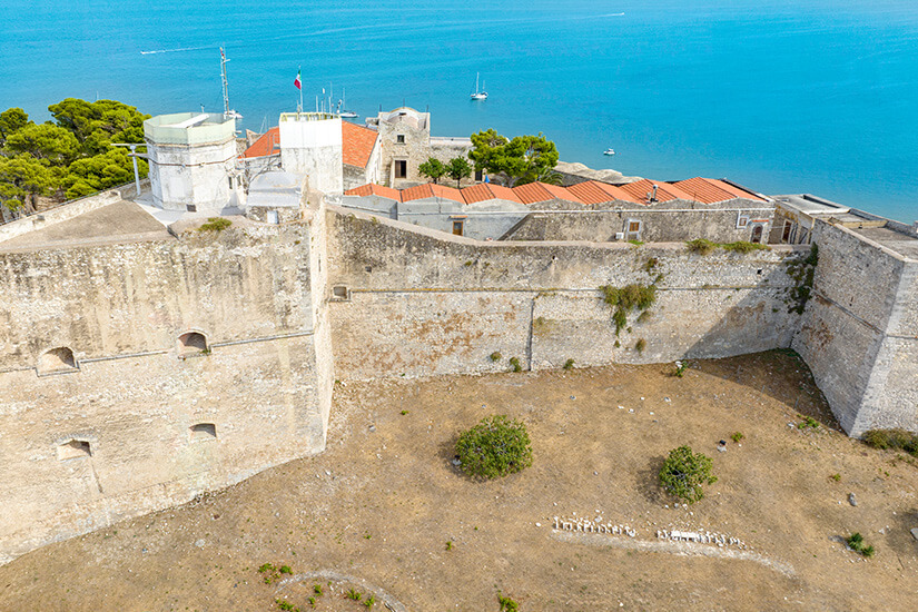 Das Schloss erhebt sich imposant über die Altstadt von Vieste und stammt ursprünglich aus normannischer Zeit. Später wurde es unter Friedrich II. von Hohenstaufen erweitert und diente lange als Festung gegen Piratenangriffe. Die strategische Lage auf einer Felsklippe erlaubte eine weite Sicht über das Meer und machte das Bauwerk damit nahezu uneinnehmbar. Heute könnt ihr die Außenmauern sowie Teile des Innenhofs bewundern und dabei noch immer einen spektakulären Blick auf die Küste und die endlose Adria genießen.