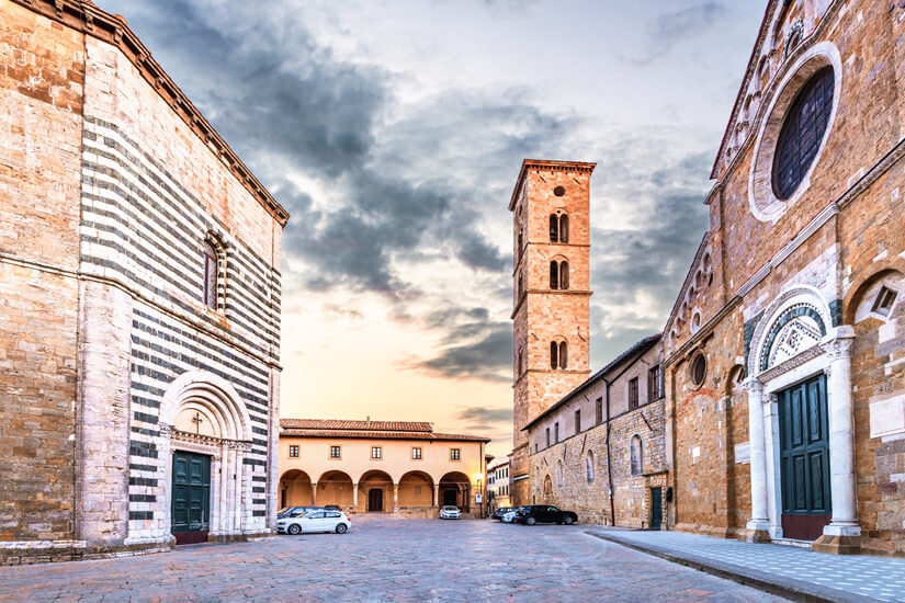 Der Dom von Volterra heißt offiziell „Kathedrale Maria Himmelfahrt“. Ursprünglich im 9. Jahrhundert erbaut, wurde er infolge von Erdbebenschäden neu aufgebaut. So geht der bis heute zu sehende Bau auf das 12. Jahrhundert zurück. Von außen vergleichsweise minimalistisch gehalten, begeistern im Inneren faszinierende Gemälde und Fresken aus dem 16. und 17. Jahrhundert. Auch der für die Region typische Alabaster ist in manchen Verzierungen vertreten. Gegenüber des Doms wurde die achteckige, dazugehörige Taufkapelle, ein Baptisterium aus dem 13. Jahrhundert, errichtet. Dessen Highlight ist ein Taufbecken aus dem frühen 16. Jahrhundert. Beide sakrale Gebäude auf der Piazza San Giovanni können kostenlos besichtigt werden.