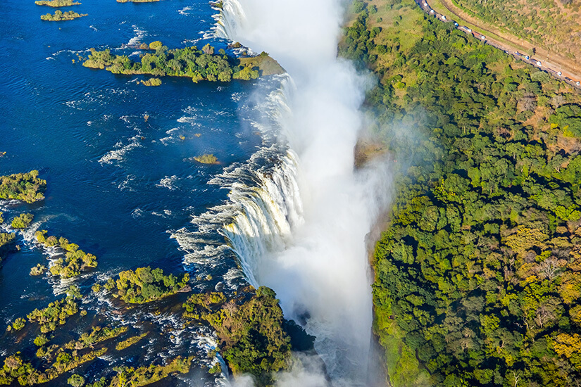 Ebenfalls an einer Landesgrenze befinden sich die Victoria Falls: zwischen Sambia und Simbabwe. Bis zu 3.000 Tonnen Wasser des Sambesis fallen hier pro Sekunde in eine Tiefe von 110 Metern – und dass nicht gerade leise. „Donnernder Rauch“ wird der Sprühregen der Wasserfälle von den afrikanischen Ureinwohnern deshalb genannt. Die Victoria Fälle gehören zum UNESCO Weltnaturerbe und ein Ausflug zu ihnen wird meist im Rahmen einer Safarirundreise durch das südlichwestliche Afrika angeboten. Dabei habt ihr nicht nur die Möglichkeit wilde Tiere hautnah zu erleben, sondern auf einem Rundweg die gegenüberliegende Seite der Wasserfallschlucht zu durchqueren. Doch auch von der schmalen Knife‘s Edge Bridge habt ihr einen sagenhaften Ausblick auf das fantastische Naturschauspiel. Die Victoria Falls werden auch als „größter Wasservorhang der Erde“ bezeichnet, da sie mit 1,7 Kilometern der breiteste durchgehende Wasserfall der Welt sind.