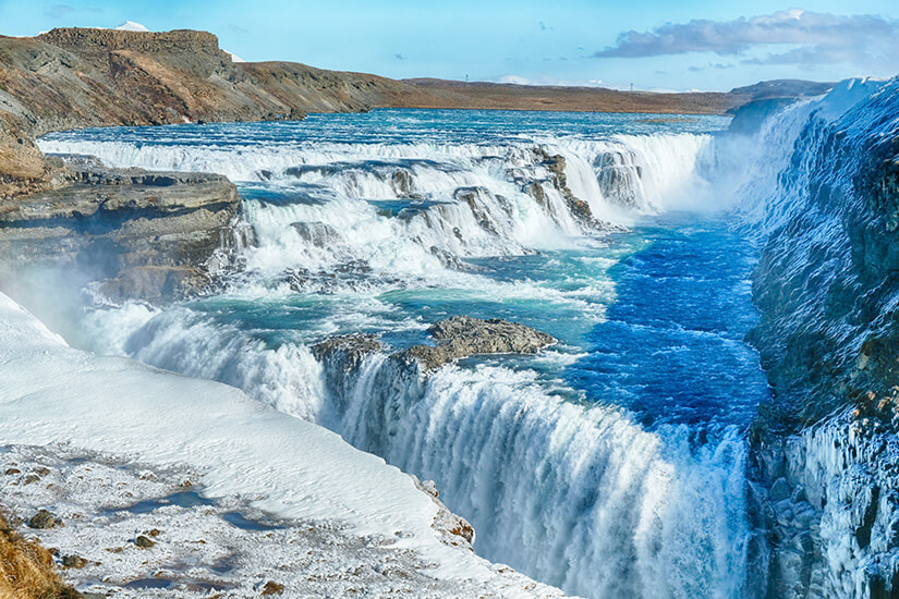 Gullfoss besteht aus zwei Wasserfällen, die im rechten Winkel zueinanderstehen. Einer davon ist 11 Meter hoch und der andere weist eine Höhe von 21 Metern auf. Wenn ihr die Wasserfälle erreicht, führt euch ein Weg oberhalb der rauschenden Fälle auf eine Aussichtsplattform, welche tatsächlich schon 10.000 Jahre auf dem Buckel hat. Aber keine Sorge, stabil ist sie trotzdem und wird euch das atemberaubende Gefühl geben, dass die Wasserfälle zum Greifen nah sind. Beinahe wäre keiner mehr in diesen Genuss gekommen, da Gullfoss in den 20er Jahren des vorangegangenen Jahrhunderts als Stromquelle genutzt werden sollte. Zum Glück setzten sich genug Isländer für den Erhalt des Naturwunders ein und ihr könnt ihn dank guter Erreichbarkeit im schönen Island jederzeit bestaunen.