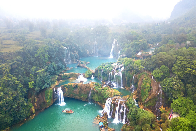 Inmitten traumhafter Landschaft sind die Ban Gioc-Detian Wasserfälle mit einer Fallhöhe von 55 Metern ein noch recht unbekannter Besuchermagnet im hohen Norden Vietnams. Geographisch liegen die Wasserfälle zwar auf der vietnamesischen Seite, doch China und Vietnam teilen sich die Zugehörigkeit.