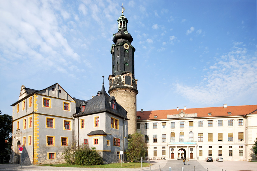 Imposant präsentiert sich die Fassade des Weimarer Stadtschlosses, das sich aus einer mittelalterlichen Wasserburg entwickelte. Auch hier wurde das erste Gebäude bedauerlicherweise durch einen Brand zerstört. Bis ins frühe 19. Jahrhundert hinein konnte jedoch der Wiederaufbau abgeschlossen werden, welchen wir bis heute bestaunen können. Auffällig ist vor allem der Rundturm mit dem markanten, barocken Aufsatz, der zu den Weimarer Wahrzeichen gehört.