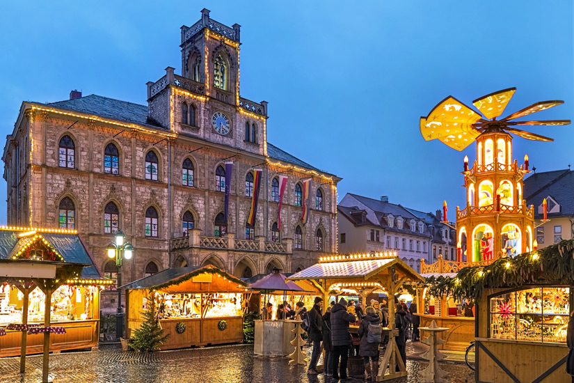 Weimar eignet sich im Grunde zu jeder Jahreszeit für einen Besuch. Ihr werdet die meiste Zeit womöglich bei den Sehenswürdigkeiten und in den Museen verbringen, stimmt’s? Da schadet auch ein wenig Regen nicht. Romantiker könnten sich die Advents- und Weihnachtszeit für einen Besuch herauspicken. Immerhin verwandelt sich Weimar dann in eine stimmig beleuchtete Stadt, die zum gemütlichen Verweilen auf Weihnachtsmärkten einlädt. Vergesst nicht, den Marktplatz zu besuchen, dessen Ostseite zu einem festlichen Adventskalender umgestaltet wird. Jeden Tag wird dort bis zum Weihnachtstag ein neues Fenster geöffnet.
