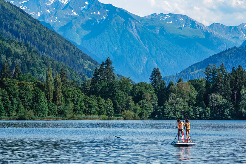Die andere Seeseite wird vom Strandbad Thumersbach, ebenfalls mit Wasserskiverleih, Beachclub und Extra-Pool neben dem See, geprägt. Das weitgehend naturbelassene Bad wurde stimmig in einen Park eingefügt. Wer etwas Neues probieren möchte, wagt sich beim Stand-up-Paddling auf den See oder riskiert einen Blick von oben auf die Wasseroberfläche beim Parasailing.