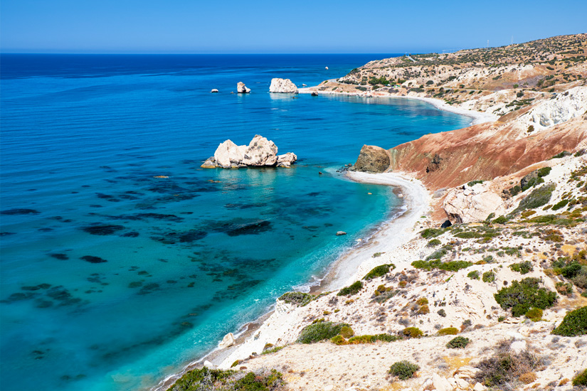 Kieselig, wild, romantisch: Das ist der Aphrodite Beach in der Nähe der Stadt Paphos im Südosten von Zypern. Der Legende nach soll die griechische Göttin an diesem Badeplatz geboren worden oder, in anderen Überlieferungen, dem Meer entstiegen sein, weshalb der Strand den besonderen Namen trägt.