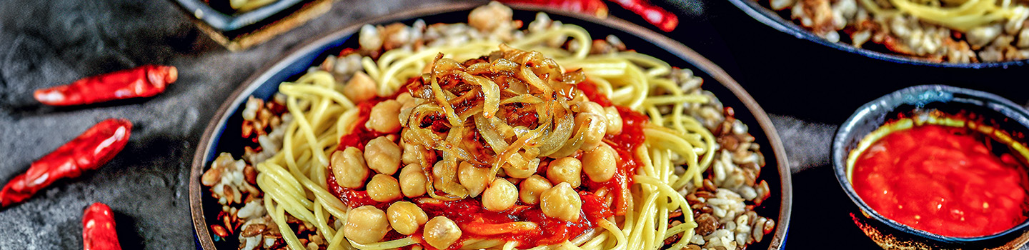 Wenn es ein ägyptisches Nationalgericht geben sollte, dann ist es wahrscheinlich Koshari, das in dem Land jeder kennt. Übersetzt bedeutet der Name so viel wie „Mischmasch“ und genau darum handelt es sich auch. Die Zutaten reichen von Reis, Nudeln und Linsen über Kichererbsen bis hin zu einer leckeren Tomatensoße. Durch die vielen Kohlenhydrate ist es sehr sättigend und hat sich von einer Speise der einfachen Bevölkerung zu einem beliebten Standard in der ägyptischen Küche entwickelt. Achtung: Sehr selten wird Hackfleisch als zusätzliche Zutat verwendet. Vegetarier sollten deshalb nachfragen.