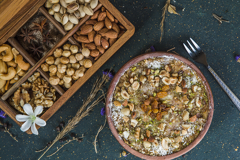 Heute ist das Gericht aus Ägypten in vielen arabischen Ländern beliebt. Es besteht aus zerpflücktem Brot oder Blätterteiggebäck, das gemeinsam mit gehackten Mandeln, Rosinen und Kokosnuss in eine Auflaufform gegeben wird. Hinzu kommt vorab mit Zucker und Schmand erhitzte Milch. Alles wird solange gebacken, bis eine goldbraune Kruste entsteht. Macht ihr Urlaub im ägyptischen Sharm el Sheik, solltet ihr dieses Dessert unbedingt probieren.