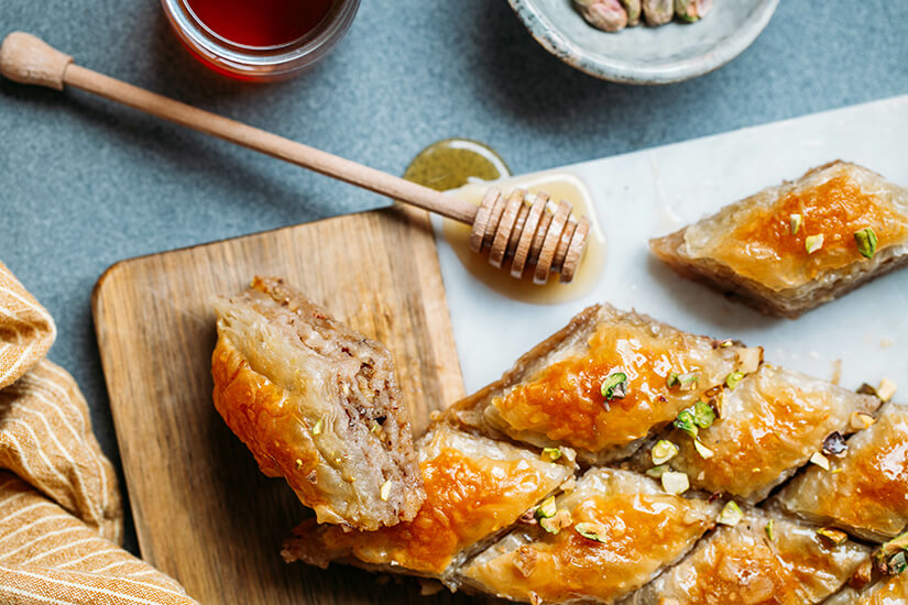 Baklava gilt als traditioneller Kuchen in der arabischen Küche. Er wird aus einem dem Blätterteig ähnlichen Teig hergestellt. Die Zutaten sind Mehl, Öl, Wasser und Salz. Für die Füllung wählen die meisten Araber entweder Pistazien, Mandeln oder Nüsse. Auch Füllungen mit süßem Sirup sind möglich.