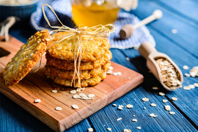 Anzac-Kekse haben drei Eigenschaften: sie sind hart, knusprig und lange haltbar. Sie bestehen aus einem Teig mit Hafer, Zucker, Butter, Sirup, Mehl und Kokosraspeln. Früher wurden sie aufgrund ihrer Robustheit Männern im Krieg an die Front geschickt. Heute sind sie eher eine angenehme Begleitung für unterwegs oder ein Snack, der sich gut backen und lange Zeit im Vorratsschrank aufbewahren lässt. Zumindest, wenn ihr der Leckerei widerstehen könnt!