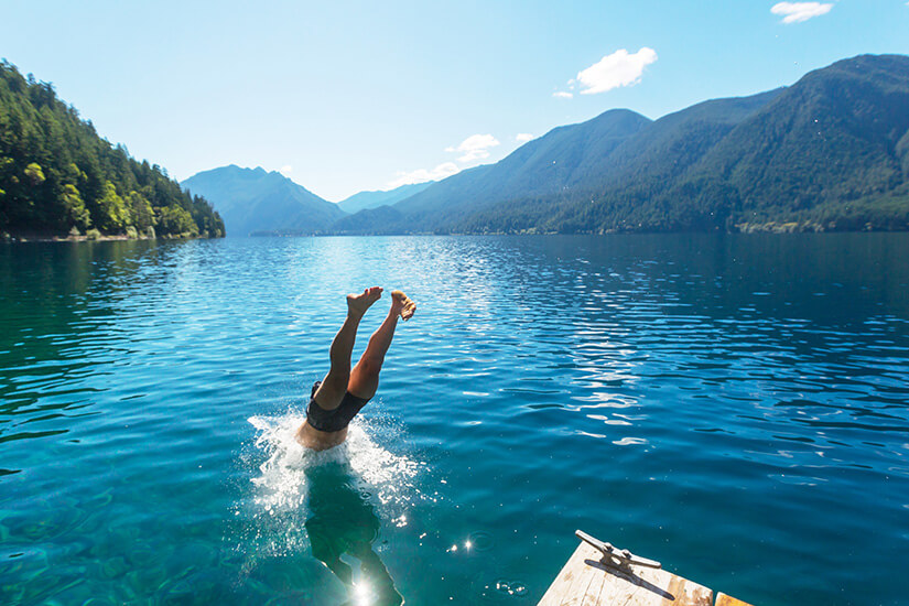 - Nicht speziell ausgewiesener Badesee: Wünscht ihr euch eine Abkühlung, die näher an der Natur ist, kommt vielleicht ein anderer See in Frage. Doch ist hier besondere Vorsicht geboten: Wenn ihr den See nicht kennt, könnte euch dessen Tiefe überraschen. Auch gibt es keine chemische Aufbereitung des Wassers, wie ihr es von Schwimmbädern gewohnt seid. Daher kann die Wasserqualität schlecht sein. Weiterhin sollten mit Pflanzen durchwachsene Gewässer und sumpfige Uferzonen gemieden werden. Im Zweifelsfall verlasst ihr euch besser auf einen Badesee, der überwacht wird.