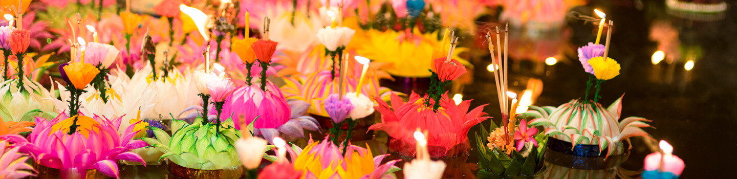 Wenn im November der erste Vollmond leuchtet, ist die Zeit für Loi Krathong gekommen. Die thailändischen Wassergeister der Flüsse und Seen werden durch auf dem Wasser treibende Kerzen und mit Blumen geschmückten Flößen geehrt. Durch geeignete Opfergaben soll die Wut symbolisch davonschwimmen.