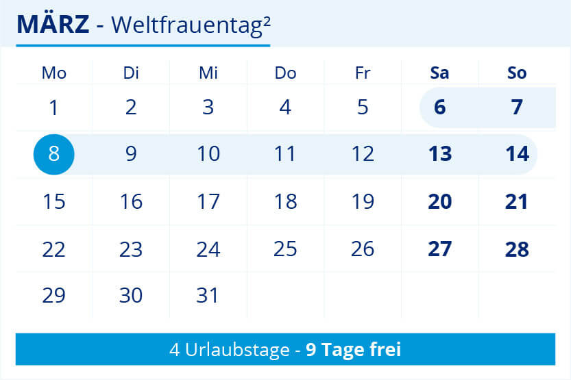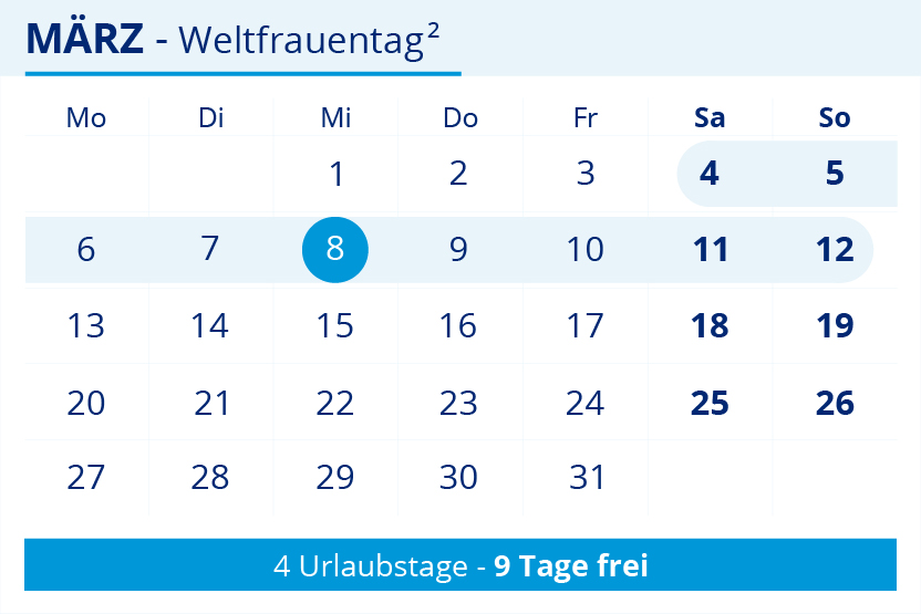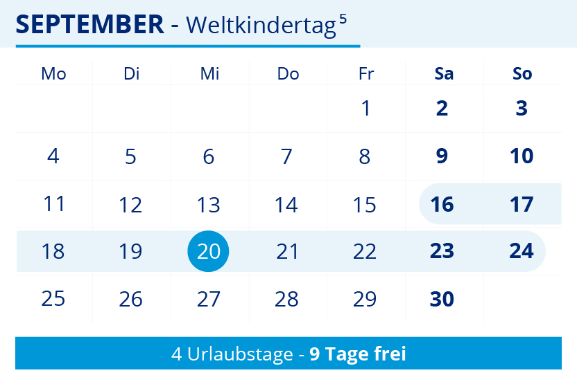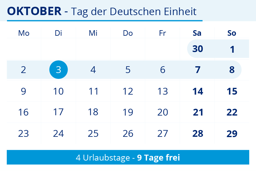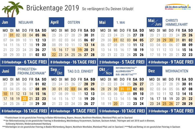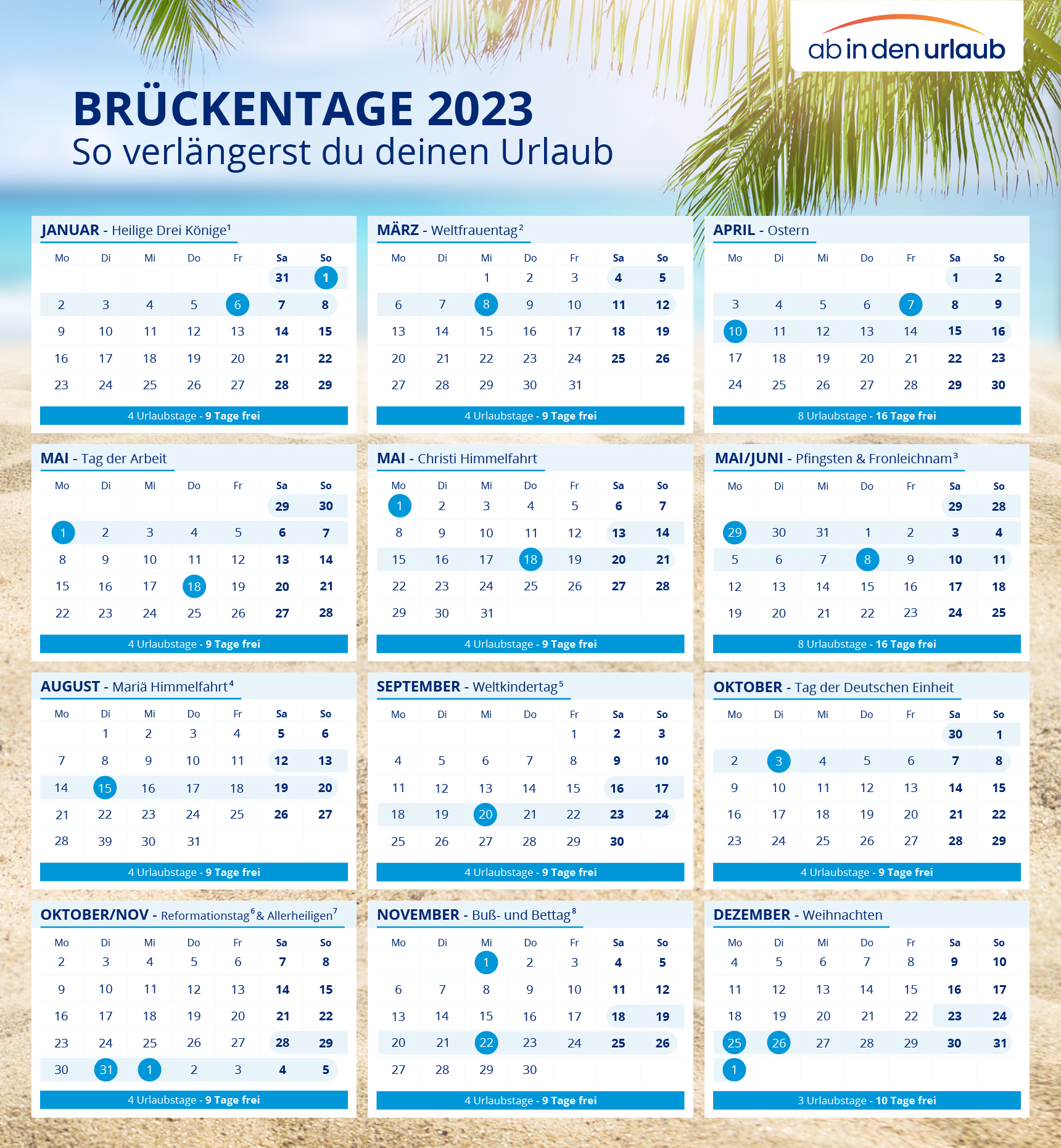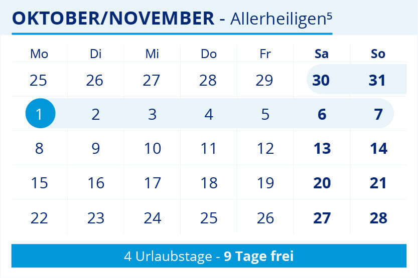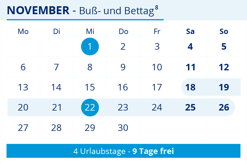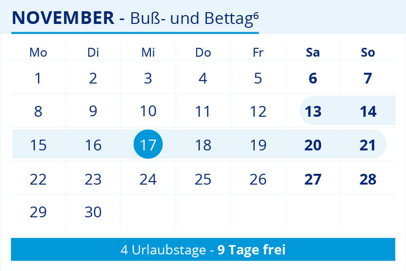 Möchtet ihr vor Weihnachten noch einmal die Akkus aufladen und dem tristen Novemberwetter entfliehen, könnt ihr euch zusätzlich noch den Montag und Dienstag vor Buß- und Bettag gönnen und so neun Tage nacheinander machen, wonach auch immer euch der Sinn steht.