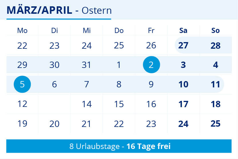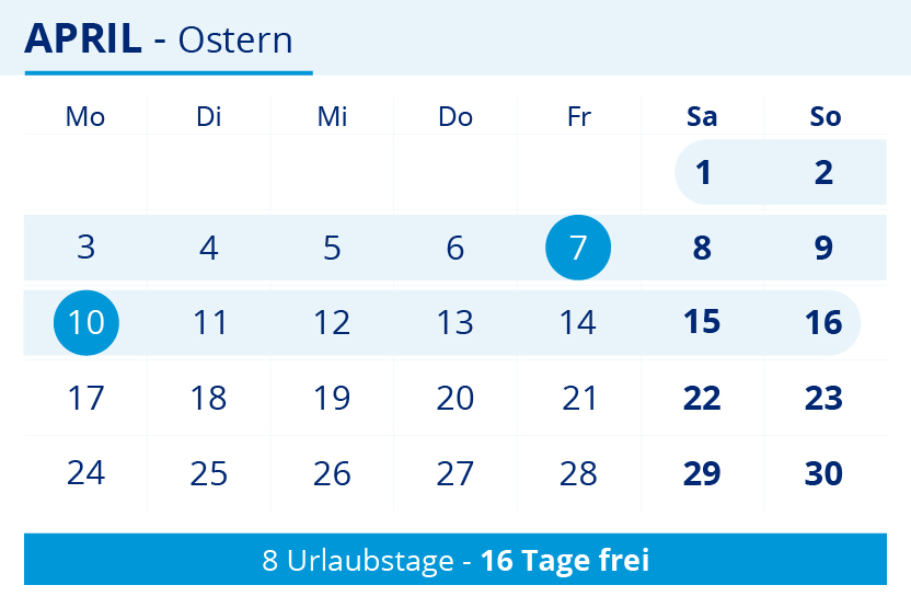 Die Osterfeiertage sind für alle Bundesbürger die erste Möglichkeit, einen längeren Urlaub einzureichen, wenn ihr die Brückentage ausnutzen möchtet. Mit nur acht Urlaubstagen könnt ihr ganze 16 Tage am Stück frei haben! Das wichtigste Fest der Christen fällt im Jahr 2026 auf Anfang April, so dass in einigen Regionen Europas schon gutes Wetter herrscht. Wollt ihr einen Teil eurer Urlaubstage lieber für den quasi feiertagsfreien Sommer aufsparen, könnt ihr auch nur die vier Tage vor Karfreitag oder nach Ostermontag nehmen. Dann habt ihr jeweils immerhin neun Tage frei.