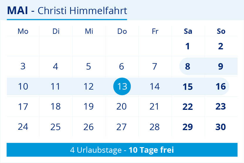 | Christi Himmelfahrt | 14.05.2026 | 3 + 1 | 11.05 – 13.05. / 15.05. |