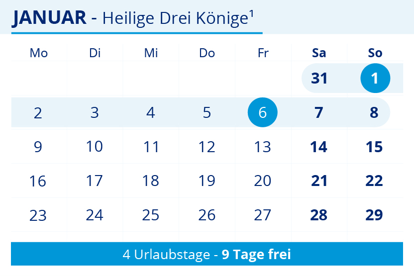 | Heilige Drei Könige¹ | 06.01.2026 | 1 + 3 | 05.01. – 09.01. |