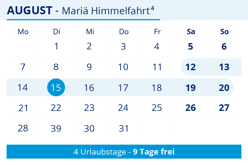 | Mariä Himmelfahrt⁴ | 15.08.2026 | ||