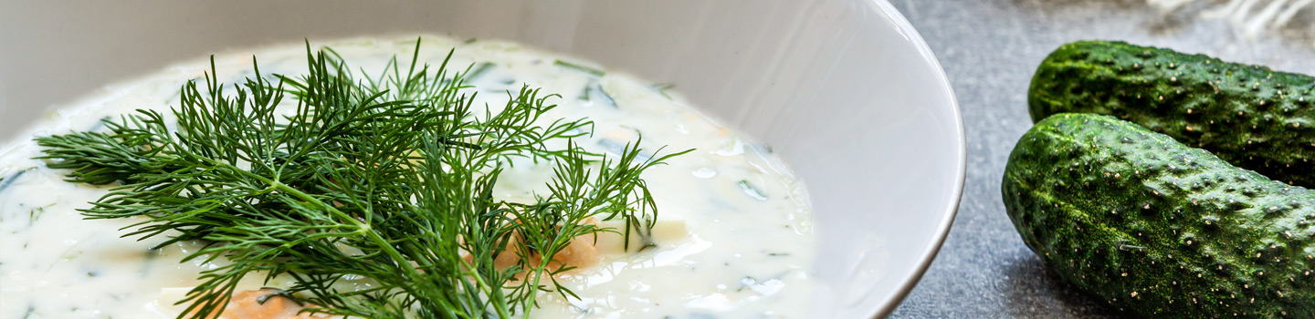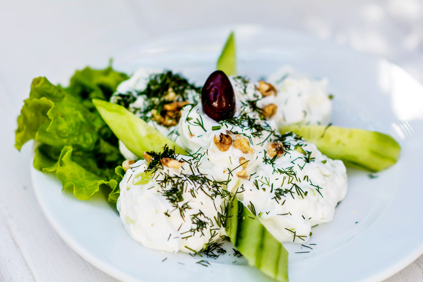 Die Vorspeise ähnelt dem typischen Tsatsiki aus Griechenland, denn der Salat besteht hauptsächlich aus Gurken, Knoblauch und Joghurt. Dazu kommen Dill, gemahlene Walnüsse, Öl und Salz für die nötige Würze. Er schmeckt wunderbar leicht und frisch.