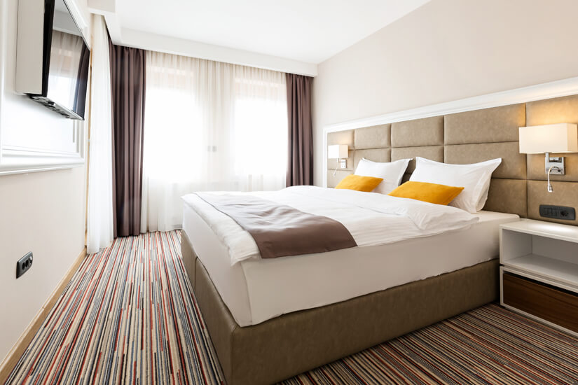 Eine Variante des Familienzimmers ist das klassische Doppelzimmer, das aber über ein Zustellbett oder eine variable Schlafgelegenheit für eine dritte Person verfügt. Dabei kann es sich beispielsweise um ein Sofa handeln, das tagsüber als Sitzplatz fungiert und abends ausgeklappt zum Schlafen genutzt werden kann. Abgesehen von diesem Zusatzschlafplatz unterscheidet sich ein Doppelzimmer für Familien nicht von anderen Doppelzimmern. Oft gibt es in Hotels die Möglichkeit, ein gewöhnliches Doppelzimmer zu buchen und gegen Aufpreis – oder manchmal auch kostenlos – ein Zustellbett für den Nachwuchs in das Zimmer zu stellen. In manchen Hotels könnt ihr euch außerdem über Zimmer freuen, die zumindest optisch den kindlichen Schlafbereich durch eine Trennwand oder eine raffinierte Anordnung der Möbel von eurer Erwachsenenschlafzone abtrennen.