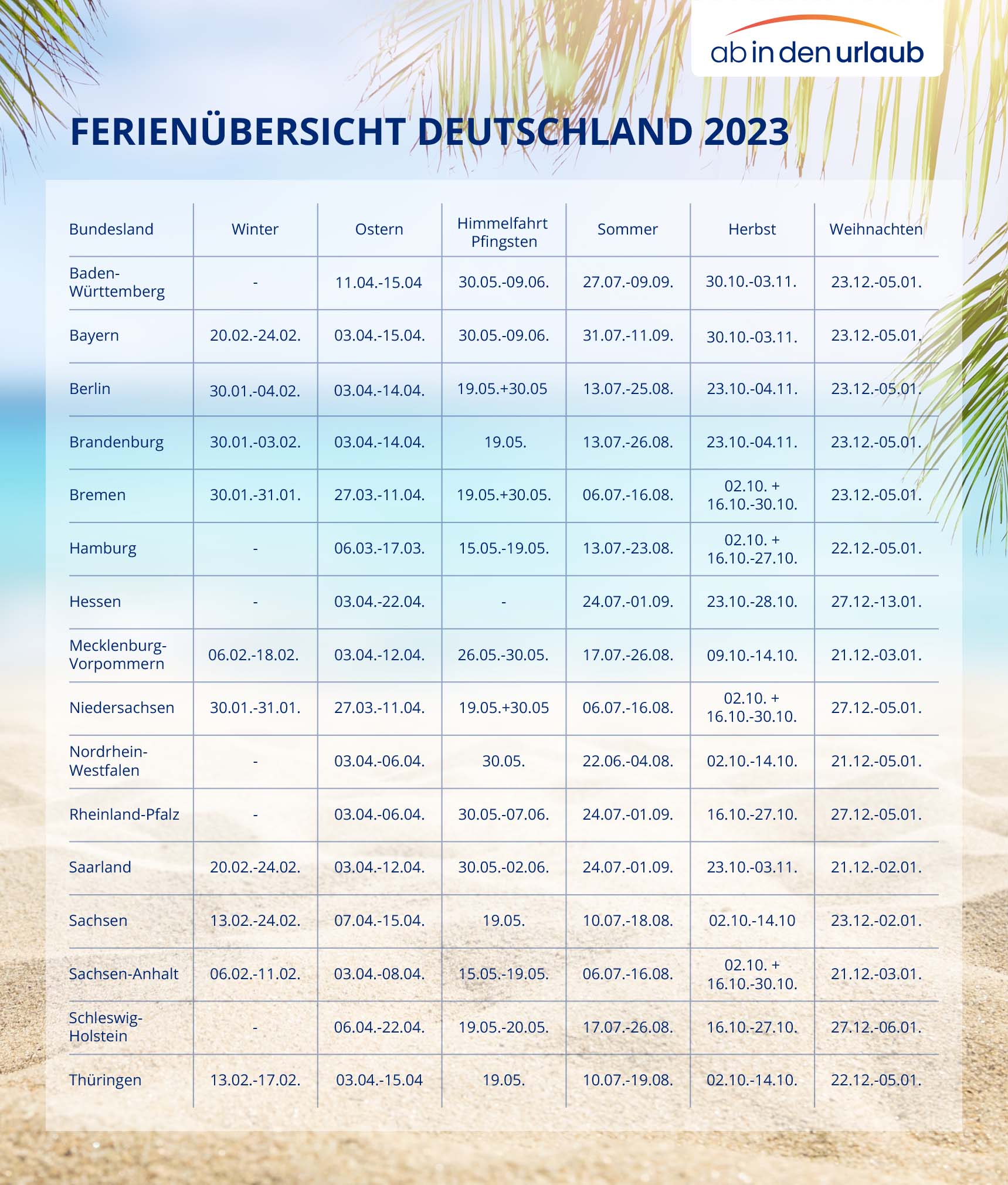 | Thüringen | 16.02.-21.02. | 07.04. – 19.04. | 30.05. | 28.06.-08.08. | 06.10. – 18.10. | 22.12.-03.01. |