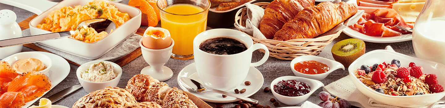 - Frühstück (z.B. zwei Brötchen und Beilagen) und Mittagsbuffet