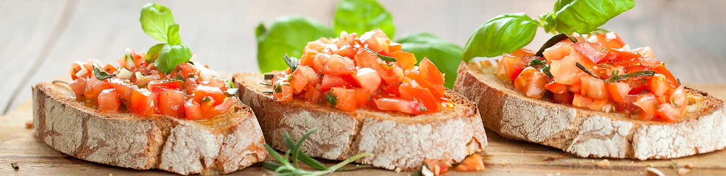 Bruschetta ist ein geröstetes, knuspriges Brot, das mit verschiedenen Belägen ausgestattet sein kann. In Kalabrien besteht das frisch gebackene Brot aus einem Belag mit Olivenöl, Oregano und gegrillter Paprika (vegetarisch), während es an anderen Orten mit Garnelen belegt wird (fischhaltig). An der Adria kommt auch eine Schinken-Variante vor (fleischhaltig). In der Toskana wird bei der Zubereitung zudem Wert auf ungesalzenes Brot als Basis gelegt.