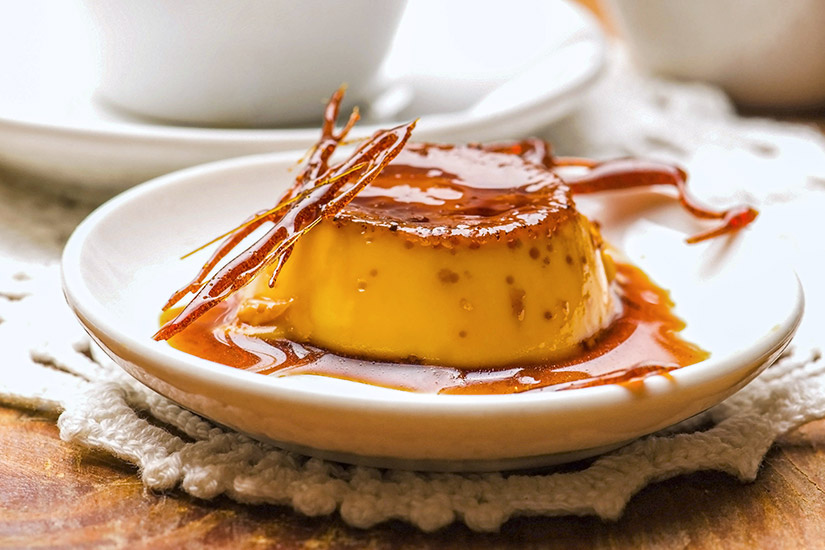 Die Karamellspeise Flan besteht aus Milch, Zucker und Eiern, die im Wasserbad zubereitet werden. Die simple Herstellung führt zu einem puddingähnlichen Nachtisch, der meist mit zusätzlicher Karamellsoße noch einmal versüßt wird.