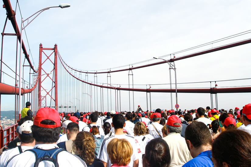 Im Oktober wird es teilweise noch bis zu 26 Grad warm in Lissabon. Perfekt für eine Anstrengung unter freiem Himmel, bei der man ordentlich ins Schwitzen kommt. Das dachten sich auch die Veranstalter des Maratona de Lisboa, dem vollständigen Marathon quer durch die Stadt, der üblicherweise im Oktober in der Hauptstadt von Portugal stattfindet. Wer nicht mitlaufen kann oder will, kann die ambitionierten Sportler vom Rand aus anfeuern und sich den einen oder anderen Snack genehmigen, der zur Veranstaltung gereicht wird.