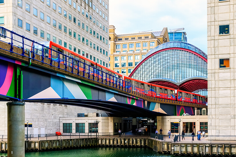- Docklands Light Railway (DLR – die Londoner Hoch-und Untergrundbahnen in den Docklands)