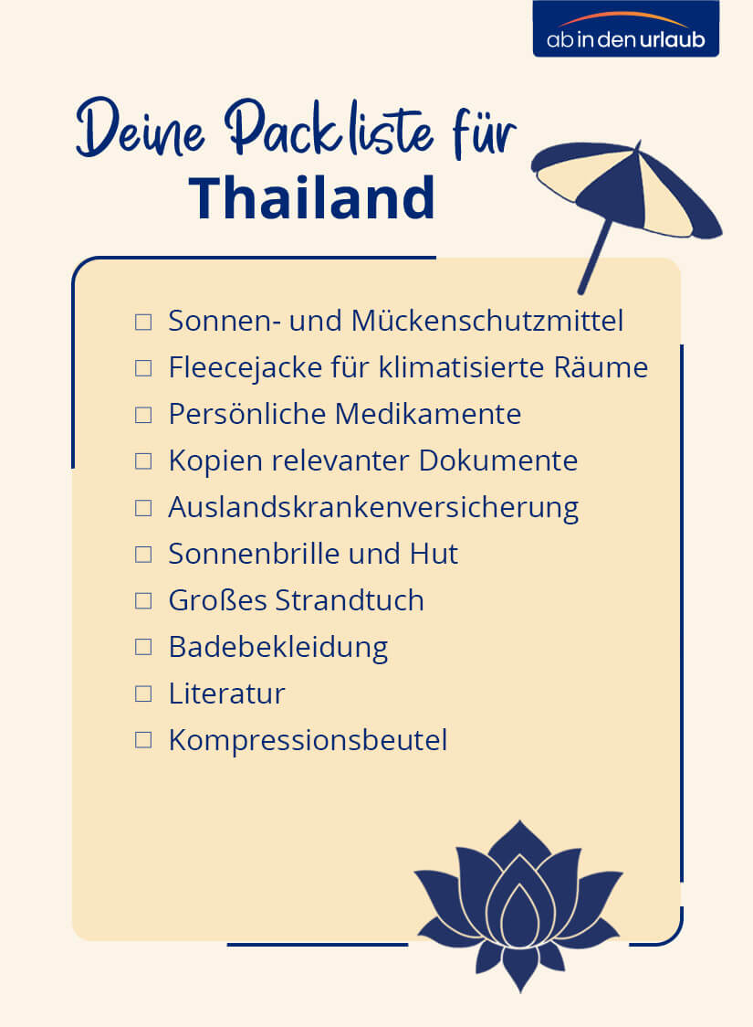 Auf nach Thailand! Könnt ihr es kaum erwarten, dass es endlich nach Südostasien geht? Und der Reisetermin rückt immer näher? Dann wird es sicher höchste Zeit, sich eine Packliste zu überlegen. Obwohl: Wenn ihr einen genauen Blick auf unsere folgenden Infos und Tipps werft, ist das lange Grübeln gar nicht mehr nötig.