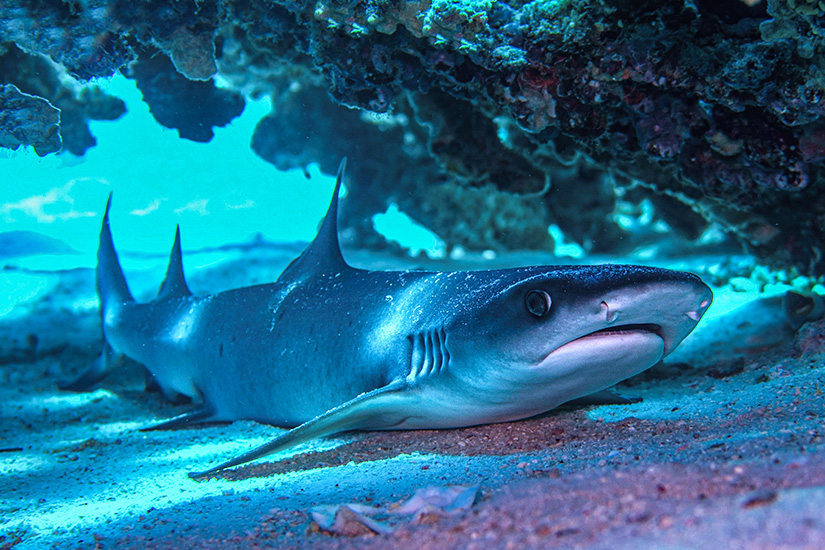Ähnlich oft wie der Schwarzspitzen-Riffhai kommt der Weißspitzen-Riffhai im Roten Meer vor. Die meisten Artgenossen werden nicht länger als 1,60 m und auch sind es die Korallenriffe, in denen sie viel Zeit verbringen. Dort schweben sie gerne über das Riffdach, sind aber auch an steil abfallenden Riffhängen und Abhängen des Meeresgrundes anzutreffen. Weißspitzen-Riffhaie zieht es eher Richtung Meeresboden und nicht an die Wasseroberfläche. Wundert euch nicht, wenn ihr sie beim Tauchen reglos am Boden oder ruhend in einer Höhle seht. Ihren Namen haben die Raubfische – wie könnte es anders sein – von der Farbe ihrer Flossenspitzen. Da sie scheu sind, gibt es auch kaum Berichte über Attacken.