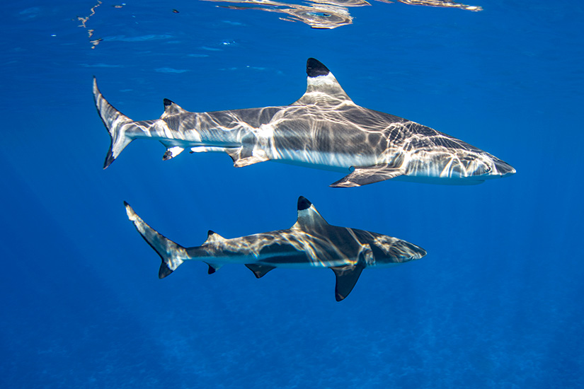Zu den am häufigsten vorkommenden Arten zählt der Schwarzspitzen-Riffhai. Er bringt es auf eine Körperlänge von 1,60 m bis 2,00 m, die Farbe ist grau bis graubraun und wie sein Name schon verrät, sind die Spitzen der Flossen schwarz. Korallenriffe – auch das ahnt ihr bereits – sind sein Lebensraum. Dabei kommt er auch an die Wasseroberfläche und schwimmt in Lagunen rein, so dass man ihn sogar vom Strand aus beobachten kann. Sie bevorzugen den Aufhenthalt in flachem Wasser. Die scheuen Fische flüchten, sobald ihr in ihre Nähe kommt. Gute Chancen, sie zu sehen, sind dann, wenn man sich ruhig verhält. Begegnungen mit Schwarzspitzen-Riffhaien sind ideal, wenn es darum geht, die Angst vor der Tierart zu verlieren.