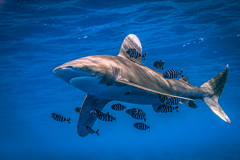 Bis zu vier Meter Länge können Weißspitzen-Hochseehaie erreichen. Da die weißen Flossenspitzen abgerundet sind, kann man sie gut erkennen. Vor den Weißspitzen-Hochseehaien müsst ihr euch in Acht nehmen, denn diese im Roten Meer lebenden Haie sind gefährlich. Gleichzeitig sind sie neugierig, weshalb ihr als Anfänger nicht unbedingt dort tauchen solltet, wo sie vorkommen. Denn gerade ihnen gegenüber muss man sich besonnen zeigen. Wer schon Erfahrung im Tauchen vorweisen kann und bereits Kontakt zu anderen Haien hatte, findet Weißspitzen-Hochseehaie beispielsweise am Elphinstone-Riff 25 km nördlich von Marsa Alam und 10 km von der Küste entfernt.