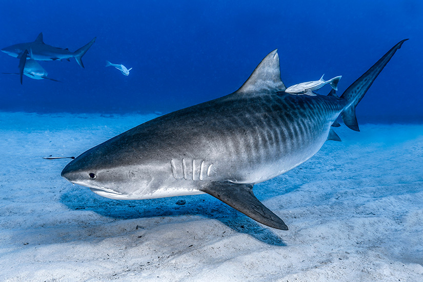 Ein selten anzutreffende Haiart im Roten Meer ist der Tigerhai, welcher um die 6 m lang wird. Ihr erkennt ihn beim Tauchen an seinen dunkelgrauen Streifen. So ist er wie der Hammerhai nicht mit anderen Haien verwechselbar. Ein weiteres Unterscheidungsmerkmal ist seine im Vergleich zu anderen Arten breite Schnauze. Die Tiere halten sich sowohl an Korallenriffen als auch in tiefen Gewässern auf. Die Einzelgänger sind neugierig und gefährlich, wenn es zu einer der seltenen Attacken kommt, endet diese häufig tödlich, weil Tigerhaie ihre Beute sofort fressen, anstatt einen Probebiss zu nehmen. Ihr Bestand gilt als potenziell gefährdet.