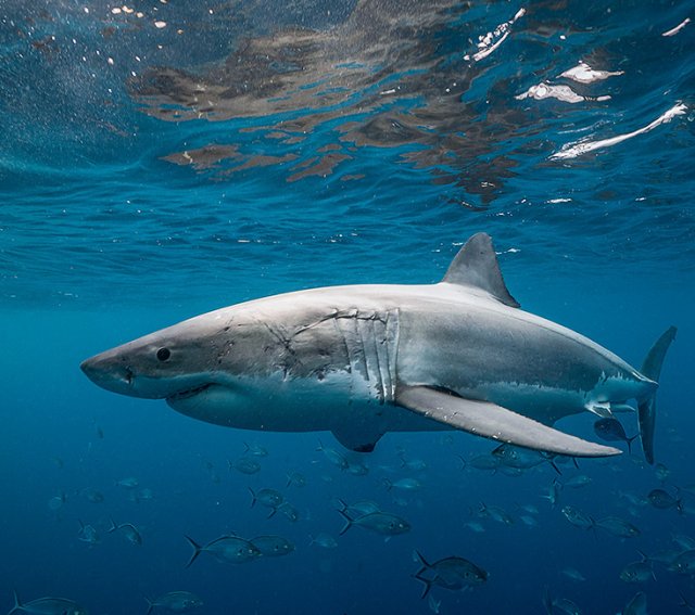 Der Makohai ist der schnellste Hai der Welt, zumindest der Kurzflossen-Mako. Mit bis zu 70 km/h soll er sich durchs Wasser bewegen. Grund für die hohe Geschwindigkeit ist neben dem Körperbau die Beschaffenheit der Haut. Die Raubfische werden zwischen zwei und vier Meter lang. Wenn sie nicht gerade in ihrer Höchstgeschwindigkeit an euch vorbeiflitzen, erkennt ihr sie unter anderem an ihren stark gebogenen Zähnen. Als eine von wenigen Haiarten besitzen sie die Fähigkeit, aus dem Wasser zu springen. Auch die Makohaie sind stark gefährdet. Bisher sind nur wenige Kontakte zwischen Hai und Mensch mit ungutem Ausgang bekannt.