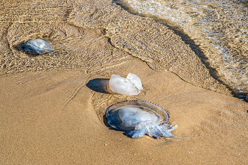 Nicht selten werden Quallen an den Strand gespült. Doch selbst tote Tiere können noch Gift aus den Nesselzellen absondern. Es gilt also, vorsichtig zu sein, wenn man sich den angespülten Meeresbewohnern nähert. Kinder sollten besonders daraufhin unterrichtet werden. Gegen zufällige Kontakte beim Laufen über den Strand helfen Badeschuhe.