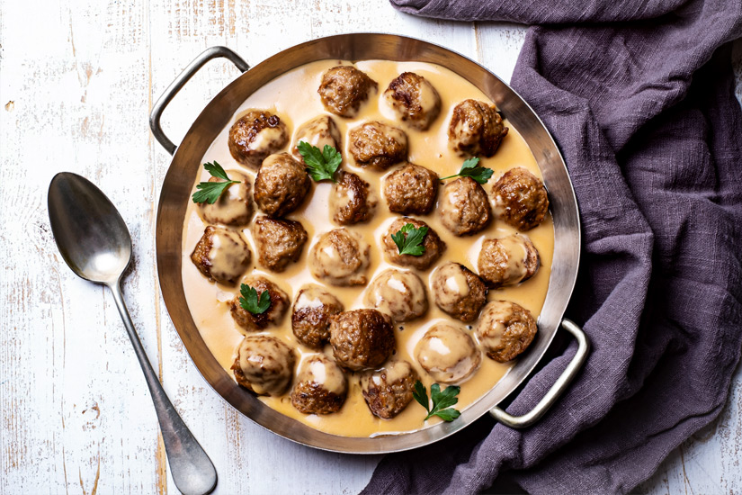 Sicherlich müssen wir euch nicht erklären, was sich hinter diesem Gericht verbirgt. Einen kurzen Überblick gibt’s trotzdem: Die Fleischbällchen bestehen aus Rinderhackfleisch, das mit Paniermehl und Milch gemischt wird. Die Würze erhalten die Fleischkugeln durch Zwiebeln, Salz und Pfeffer. Dazu gibt es eine Rahm- oder Fleischsoße sowie Beilagen aus Kartoffelpüree und Preiselbeersoße. Kinder bevorzugen hier manchmal auch Pommes frites, eine weitere Alternative sind gekochte Kartoffeln.