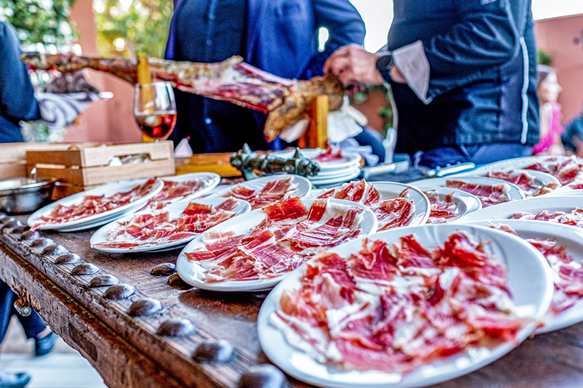 Die bekanntesten und beliebtesten Schinkensorten stammen aus dem Südwesten des Landes, etwa aus Andalusien oder der Extremadura. Die Iberischen Schweine werden dort auf sogenannten Dehesas gehalten. Das sind Eichenhaine, die als Weide genutzt werden. Dank der Ernährung mit Eicheln erhält der Schinken sein besonderes Aroma.