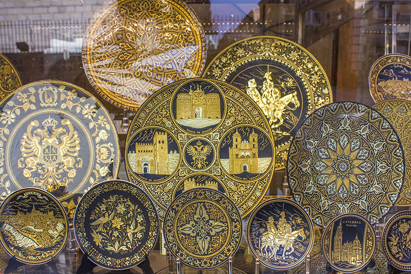 Früher diente diese Arbeit dem Verzieren von Waffen und Rüstungen, wie Funde aus mittelalterlichen Gräbern belegen. Für die heute so begehrten Souvenirs geht es etwas weniger martialisch zu. So gibt es in Toledo tauschierte Schatullen und Armreifen oder auch Gebrauchsgegenstände wie Teller, Becher und Vasen.