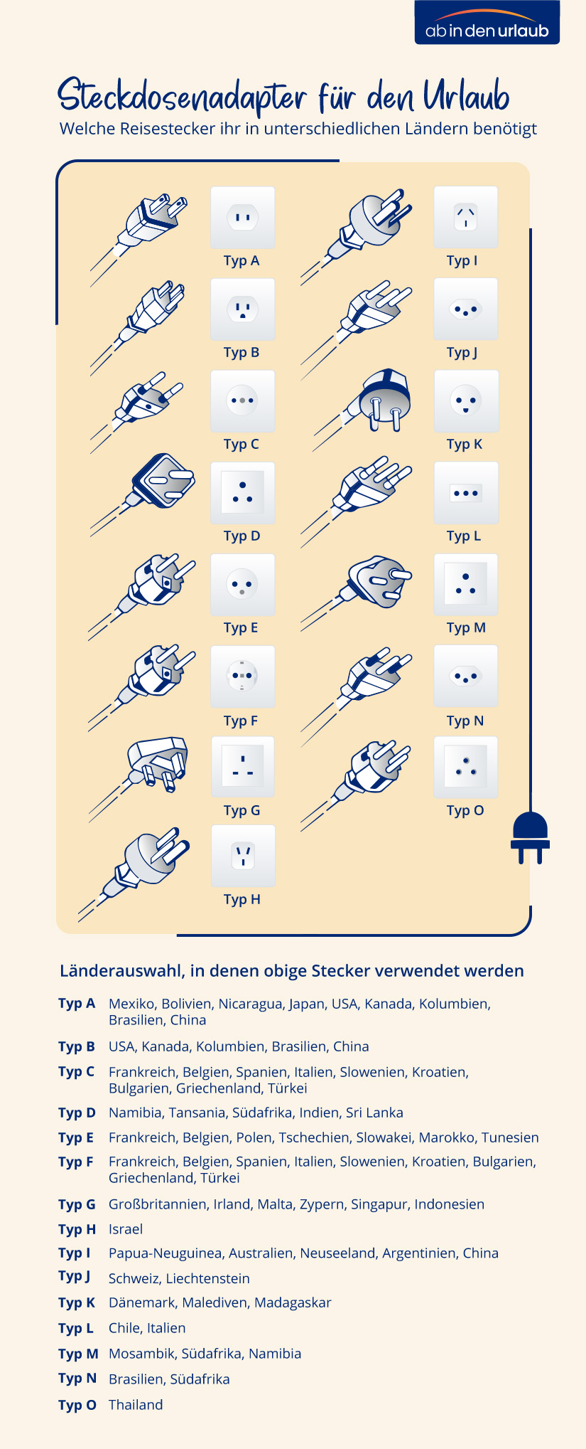 Die weltweit verwendeten Steckertypen und Steckdosen sind anhand von Buchstaben eingeteilt und lassen sich so voneinander unterscheiden. Weichen Steckertyp und Steckdose von in Deutschland verwendeten Typen ab, muss im Auslandsurlaub eventuell an einen Steckdosenadapter gedacht werden. In Deutschland werden Typ F und C verwendet.