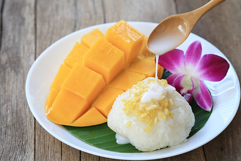 Der süße Mango-Klebereis gilt als beliebteste Süßigkeit in Thailand. Die spezielle Reisart wird zunächst mit Zucker und Kokosmilch gekocht, bevor gerösteter Sesam und eine frische, aufgeschnittene Mango hinzukommt. Mit Salz wird das Ganze abgeschmeckt. Auf Wunsch gibt es außerdem eine Kugel Eis (Vorsicht – durch Milcheis ist das Gericht natürlich nicht mehr vegan). Vor dem Servieren wird der Klebereis meist noch einmal mit Kokosmilch übergossen – thailändisches Essen mal besonders süß.